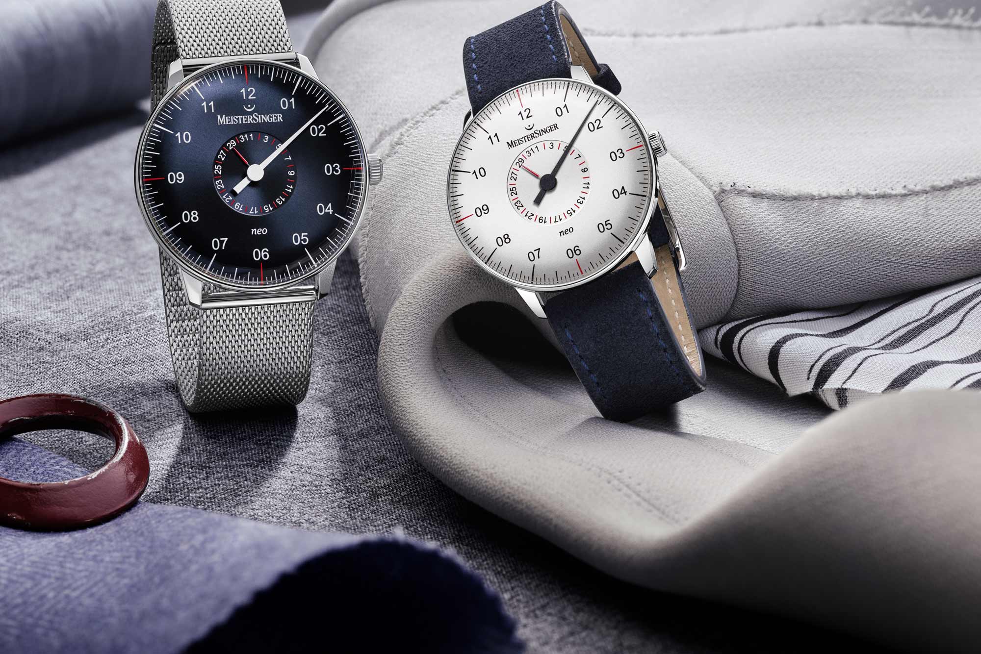 The other one also combines blue, yet now with a matte sand grey color. The legibility of both versions is superb, another hallmark of MeisterSinger, with comfortable straps made from cordovan leather.